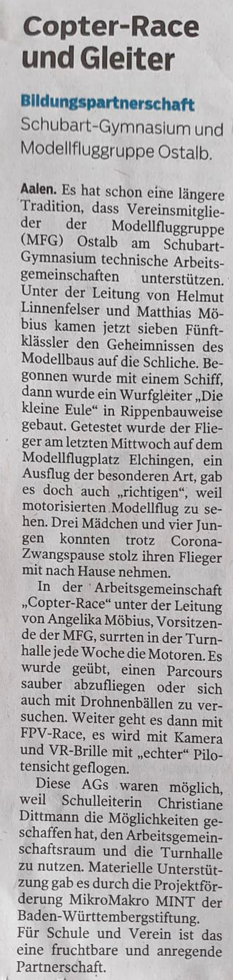 Schule arbeitete dazu mit der Modellfluggruppe Ostalb zusammen, die die