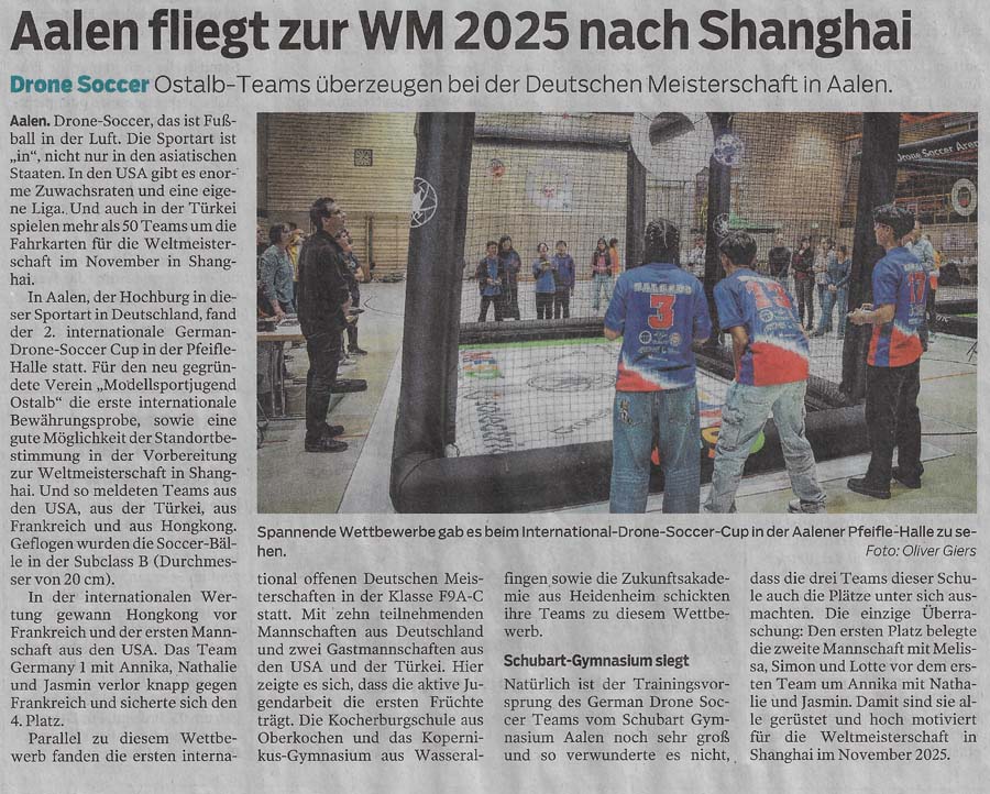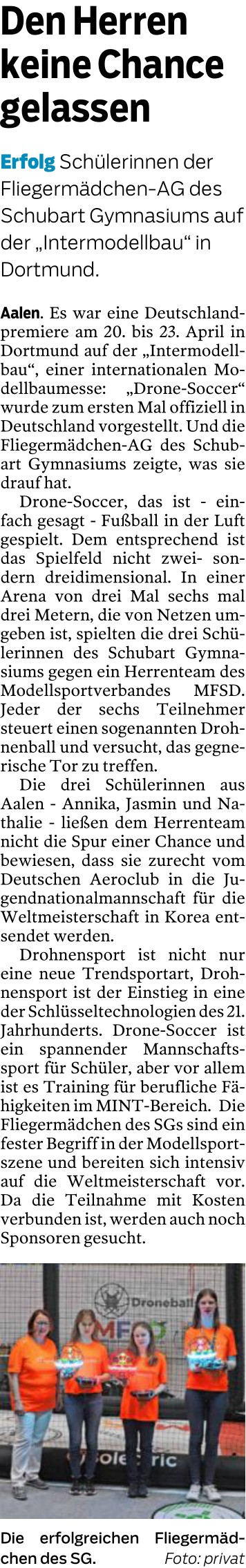 Am Wochenende berichtete die Heidenheimer Zeitung über unser Schulprojekt und die Drohnen AG auf einer Doppelseite. Da sich diese hier nicht abbilden läßt, habe ich den Text der On-line Ausgabe entnommen : In der Turnhalle fliegen lernen