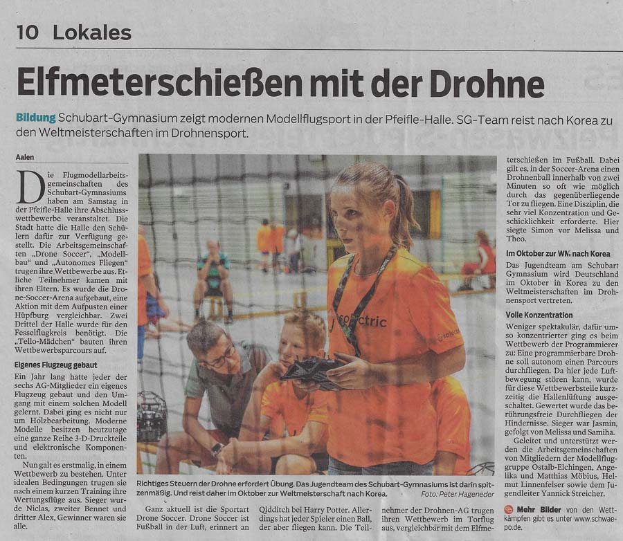 Am Wochenende berichtete die Heidenheimer Zeitung über unser Schulprojekt und die Drohnen AG auf einer Doppelseite. Da sich diese hier nicht abbilden läßt, habe ich den Text der On-line Ausgabe entnommen : In der Turnhalle fliegen lernen